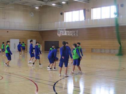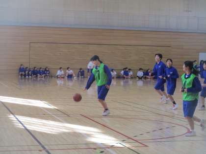 男女混合でゲーム形式でバスケットボール競技をしています。体育館内は、10度を切っています。