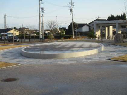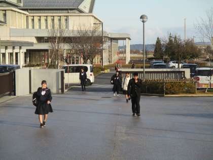 八尾中学校の生徒玄関前にある「八尾のニワ」では、中央のステージに霜が降り、太陽の光が当た始めたところから徐々に溶けていく様子が見られました。【写真上】