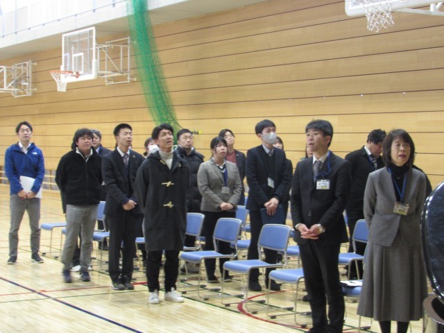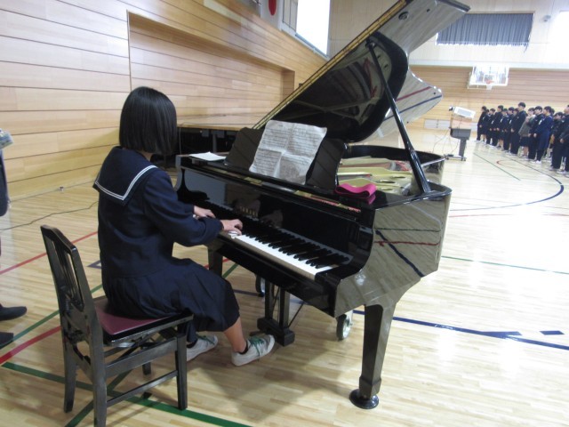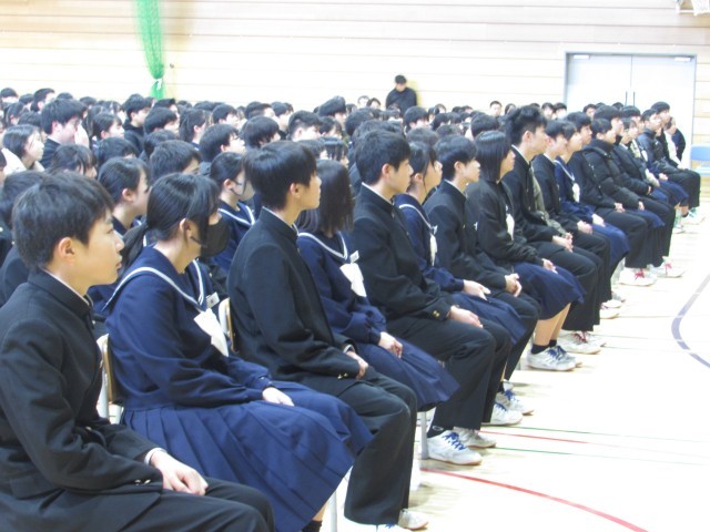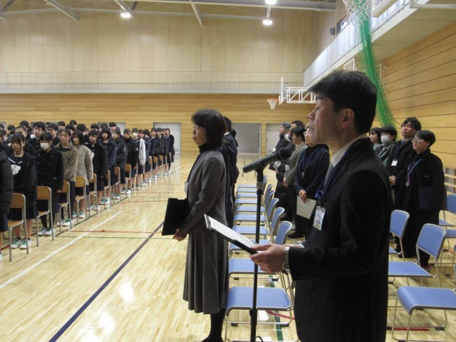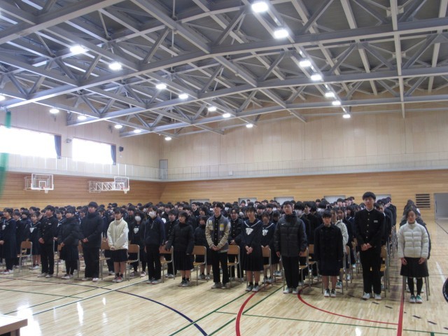 全校生徒、教職員が体育館に集まり、第3学期始業式を行いました。