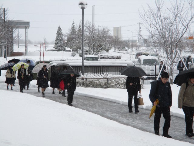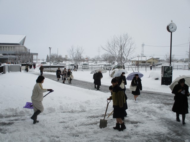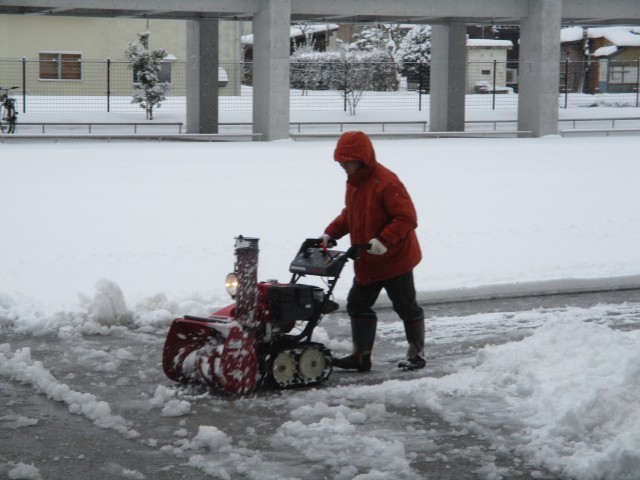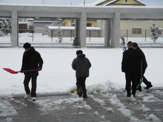 1月10日(金) 雪の朝 公開日 2025/01/10 更新日 2025/01/10 八尾中学校のページ 八尾町で最低気温氷点下2.8度と、今シーズン最も寒い朝となりました。用務員さんが1時間前から除雪をしてくださっていたので、門から生徒玄関まではスムーズに通ることができます。保護者の皆様の送迎も、一方通行で整然としてくださりありがとうございます。 今朝の除雪当番は、2年1組。除雪をありがとう。 柴田理恵号も大活躍中です。 +1