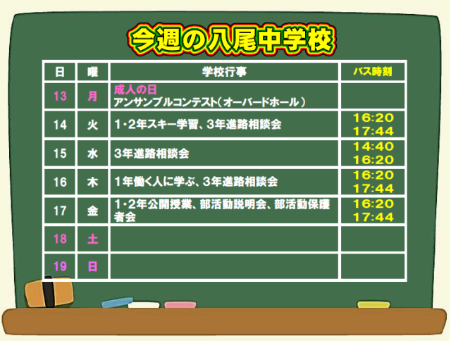 1・2年生はスキー学習が予定されています。インフルエンザが猛威を振るっているようです。体調管理に気を付けて、1日1日を大切に過ごしましょう!