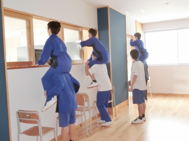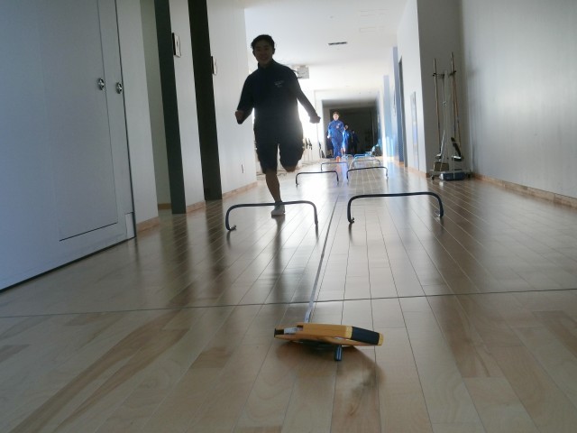 陸上競技部は、校舎内でいろいろな部分を鍛えるためのトレーニングを行いました。