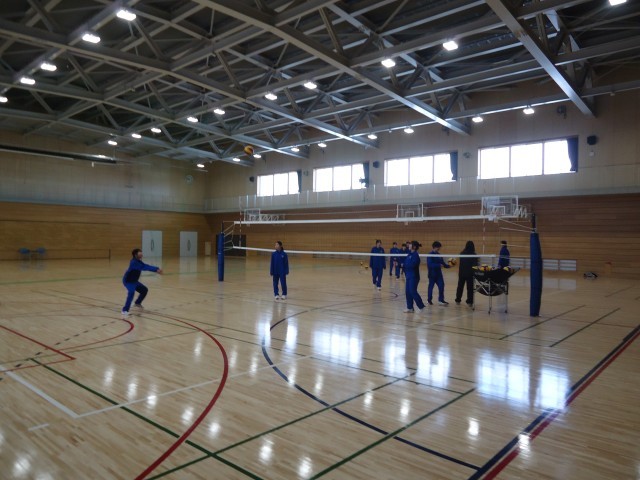 体育館では、女子バレーボール部がレシーブ練習をしています。