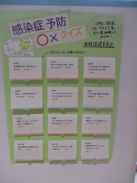 生徒玄関前に感染症予防○×クイズが掲示してあります。ぜひ、やってみてください。