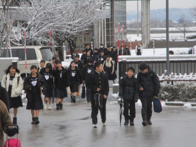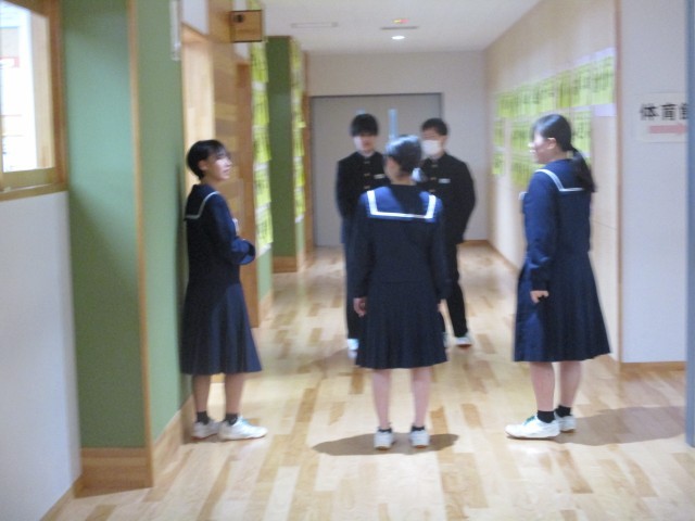 バスが到着し、たくさんの生徒が降りてきました。2年生は、朝のリーダーミーティングを続けています。