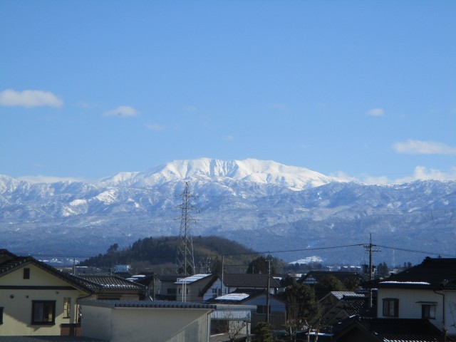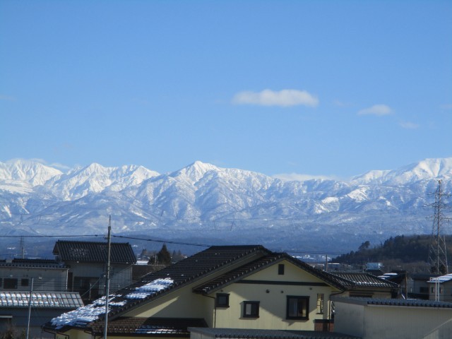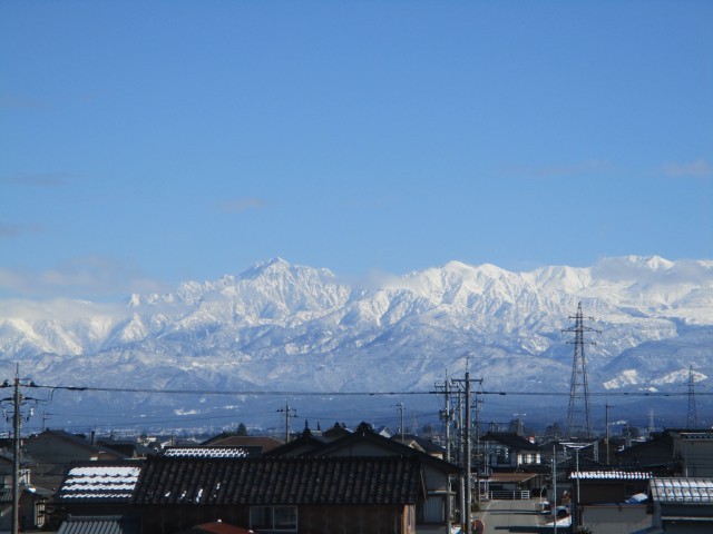 今日は、青い空に白い立山連峰がくっきりと見えます。すぐそこに剣岳があるかのように見えます。