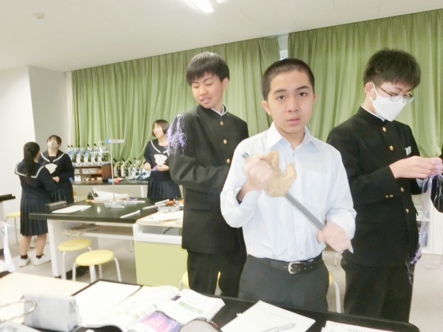 様々な物をこすり合わせて、静電気を発生させ、その性質を探りました。