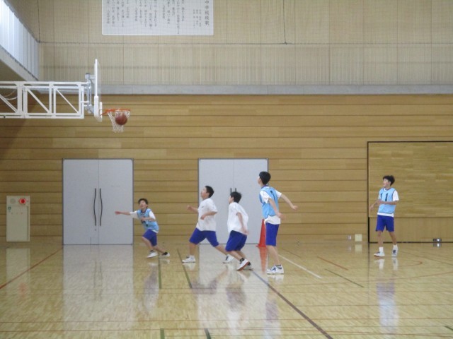 体育館で3on 3の練習をしています。今日はいつもより体育館内の気温が2度高いです。