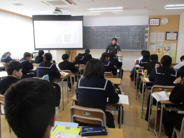 写真上は、英語の授業の様子です。過去形を使った少しまとまった英文を読解中です。