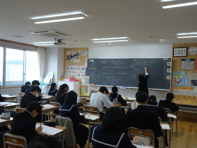 写真下、数学の授業では、「三角形の合同証明」の学習をしています。図を見て真剣に考えています。