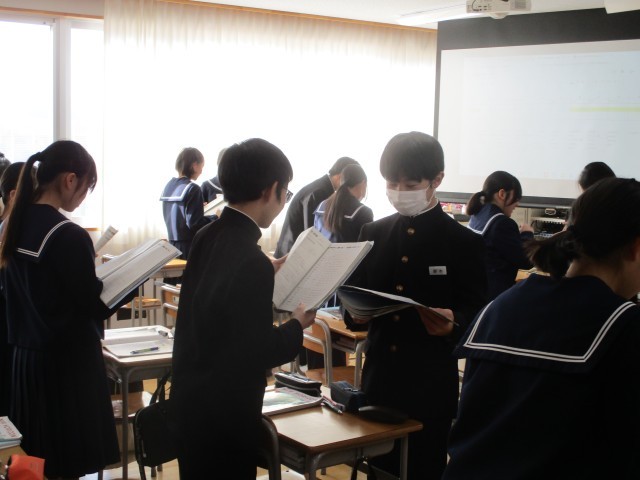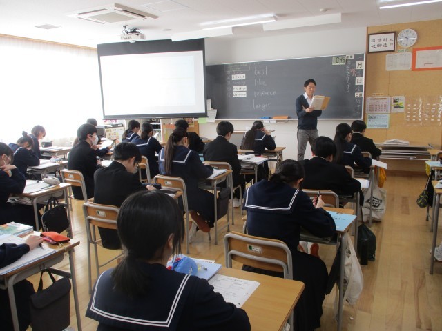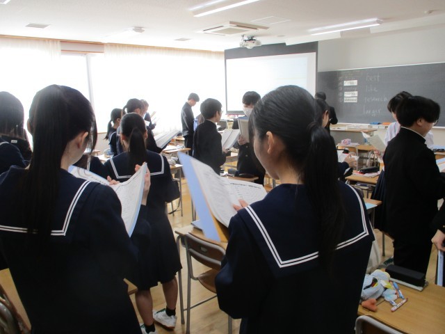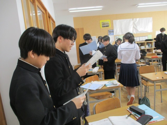 最初は先生の後について、次はペアで音読練習をしています。ペアの相手は、英文を和訳しています。