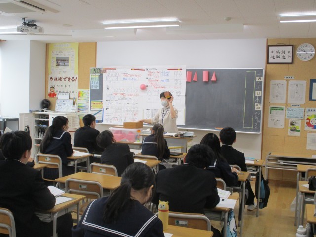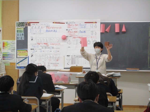 直方体、立方体、円錐、円柱、、、等、具体的に実物を見せながら、側面の形や底面の形を確認して定着を図っています。