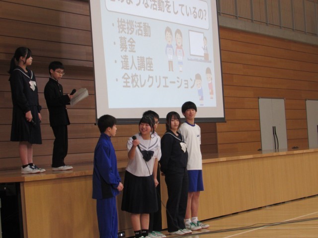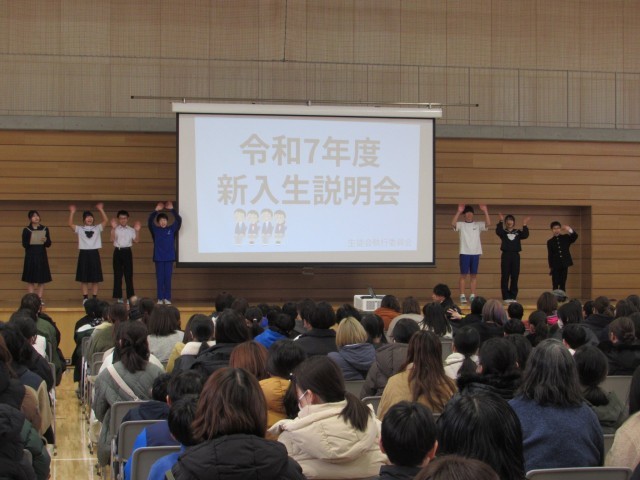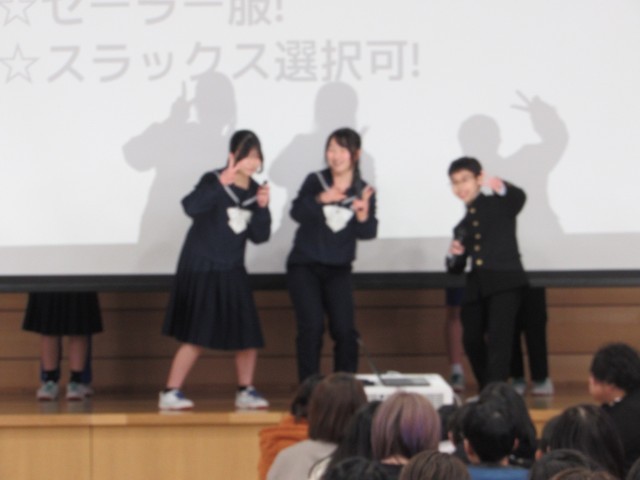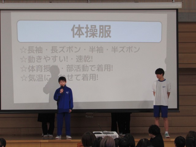 生徒会執行部による「学校生活について」では、生徒がステージ上でファッションショーのように、音楽に合わせて楽しく「制服」「体育服」を披露し、自然と会場に拍手が起こりました。