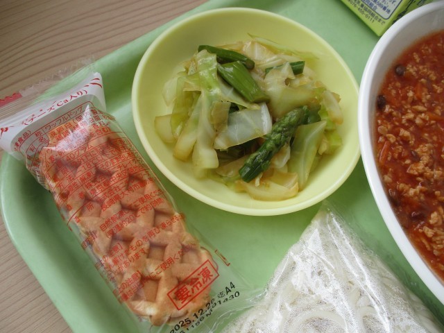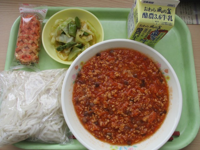今年度最後のソフト麺です。3年生の皆さんにとっては、給食で食べる最後のソフト麺です。味わって食べましょう。