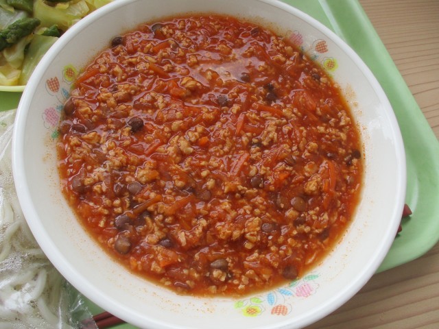 ミートソースの中の平たい豆は、レンズ豆です。光学用途で使われる「レンズ」の語源は、このレンズマメで当初作成された凸レンズがレンズマメの形状に似ていたことからこの名前が付いたそうですよ。人類が利用してきたマメの中で最古の部類に入るそうです。新石器時代の紀元前6000年頃から肥沃な三日月地帯で栽培が始まり、ヒヨコマメやソラマメと並んで重要な食物となったのです。豆に歴史あり。