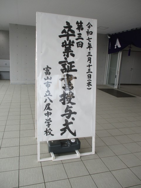 3月13日(木) 第3回 卒業証書授与式 その1 公開日 2025/03/13 更新日 2025/03/13 八尾中学校のページ 卒業式当日の朝です。 玄関幕や国旗も設置され、体育館や教室など全ての準備が整いました。 あとは、主役の卒業生を待つのみとなりました。 +4