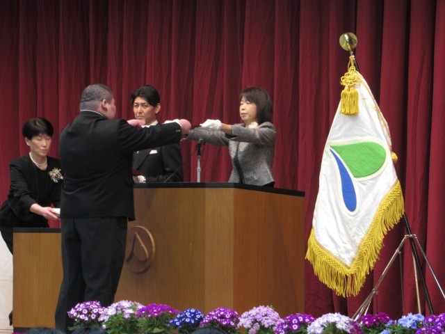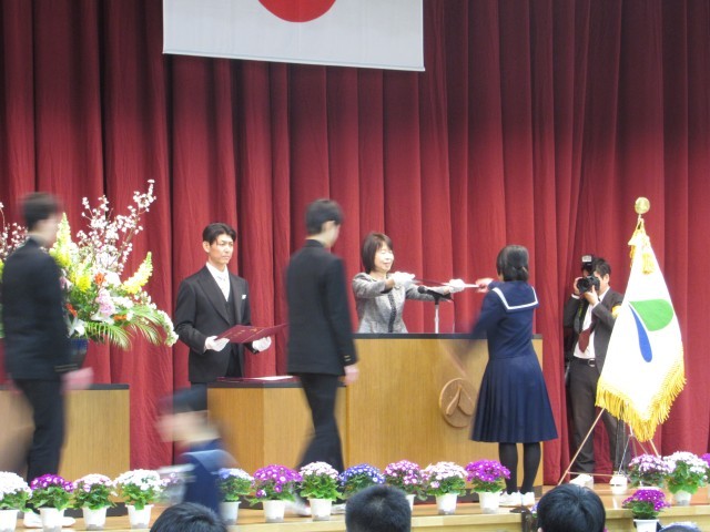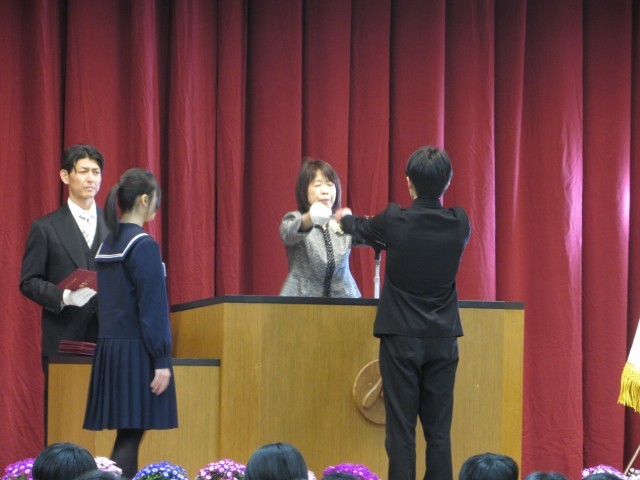 卒業証書授与では、呼名されると大きな声で返事をして、緊張しながらも校長先生からしっかりと卒業証書を受け取りました。