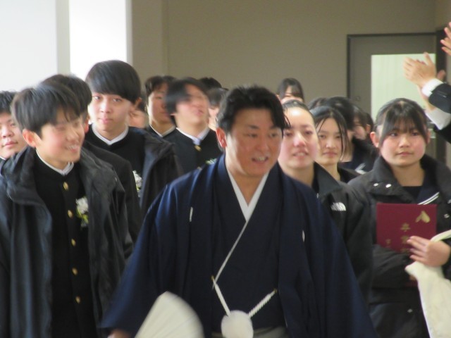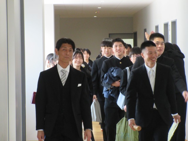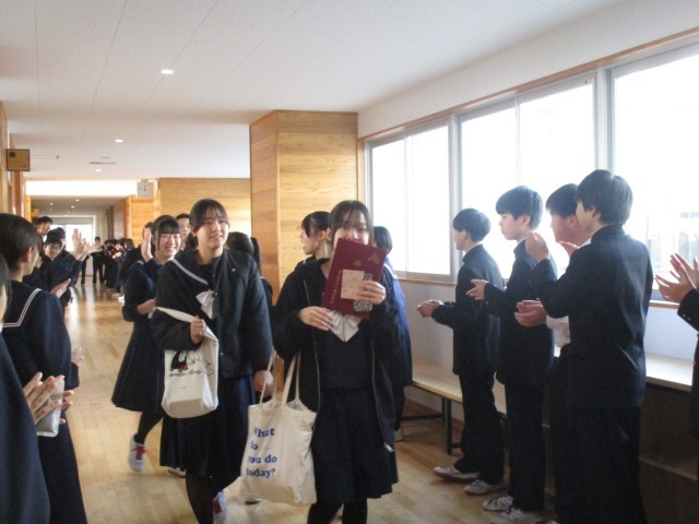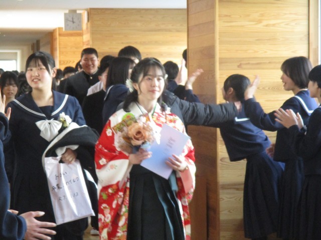 後輩たちが拍手で送り出しました。卒業生は、懐かしい校舎をぐるっと回りながら、玄関へと向かいます。