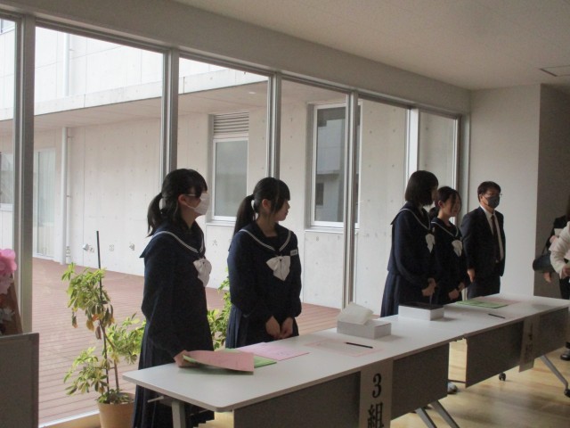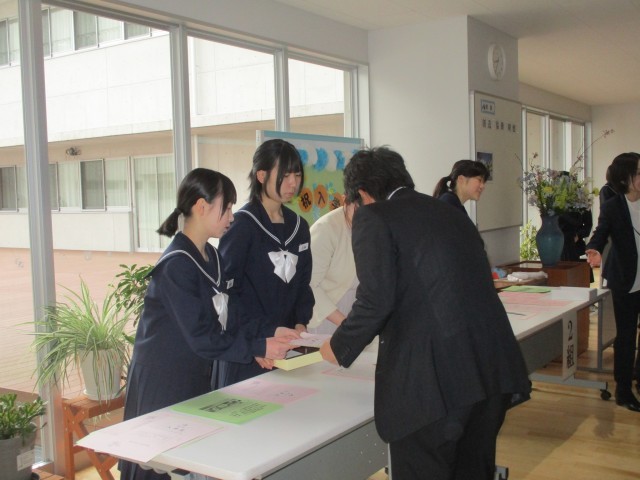 8時30分に受付が始まり、新しい制服、新しい内履き、新しいかばんを身に着けた新入生が続々と玄関に入ってきました。3年生が、新入生の誘導や保護者受付、各教室への案内、誘導を行いました。仕事でしっかりと「見せつけて」くれました。