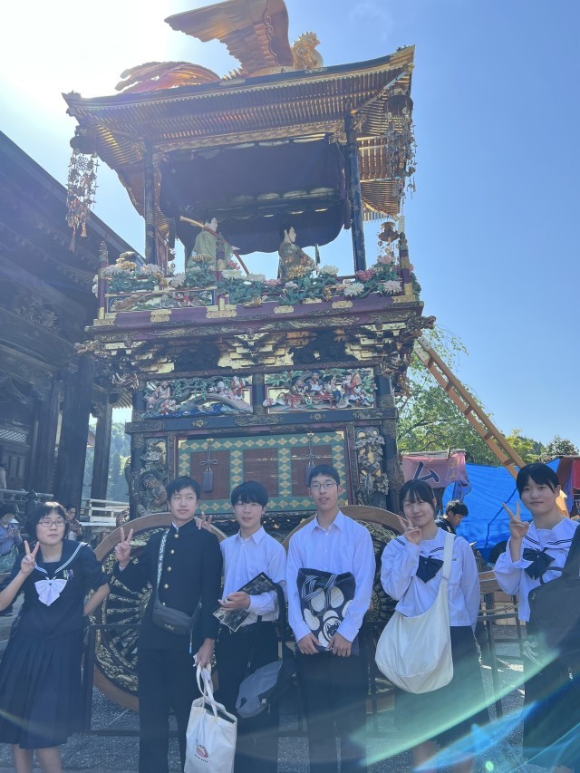 今日は八尾の一大行事、曳山祭りです。3学年からは「八尾をプロデュース」の一環として、曳山祭りをより詳しく知ろうと、案内部の生徒が参加しています。この後、曳山について詳しく教えていただきます。