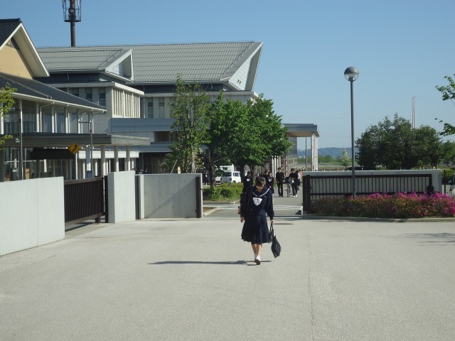 新緑の香りが漂う清々しい空気の中、生徒たちが登校しています。