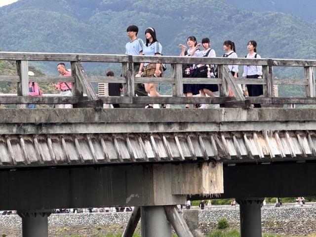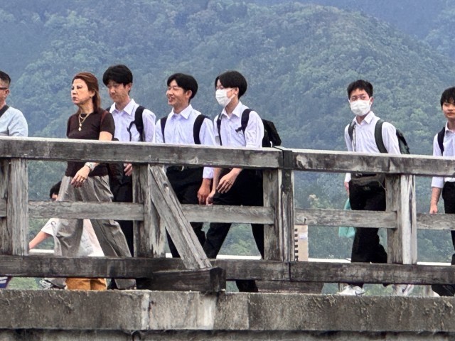 渡月橋の様子です。京都らしさを味わいながら渡っているように見えます。