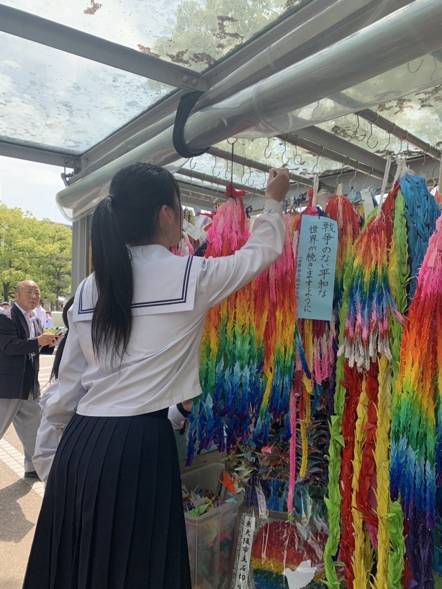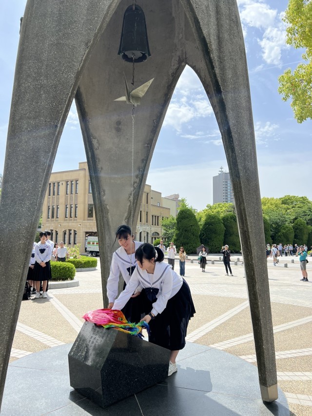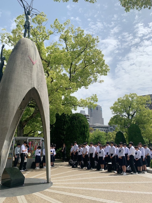 平和セレモニーを行いました。平和の誓いを全員で宣言し、本校の校歌を捧げました。