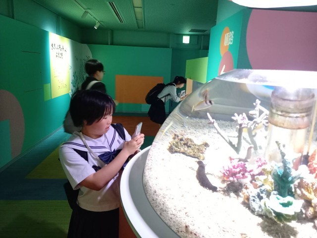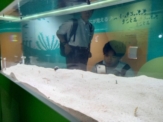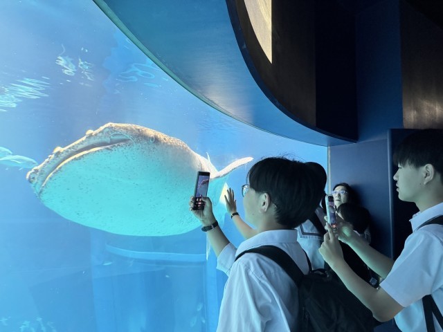 2組、大水槽のジンベイザメや多くの海洋生物に見惚れています。
