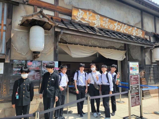 1組、ようやく東映太秦映画村に到着しました。お化け屋敷に入る班も…