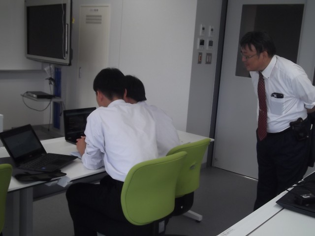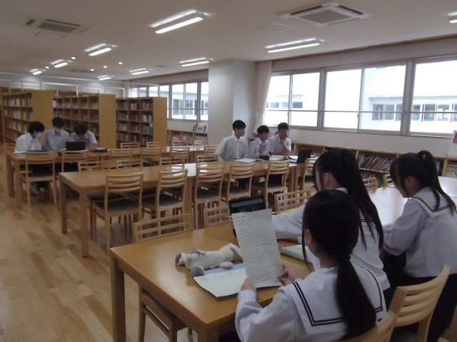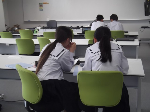 今日と明日、3年生はマレーシアの生徒さんと、オンラインで英語で交流します。2~3人の小グループで、今持っている英語の力を駆使して、協力して取り組んでいます。あちこちで笑顔や笑い声があり、楽しそうに活動しています。交流の架け橋となってくださった富山大学の先生が、生徒の状況を見守っています。