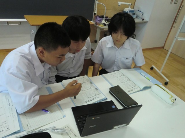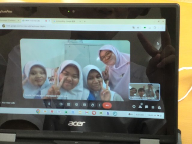 6月12日(木)3年生 海外オンライン交流(3、4組) 公開日 2025/06/13 更新日 2025/06/13 3学年 ALTを除くと、初めて外国の方を話す生徒が多かったようです。対話している途中「あれ何て言えばいいんだろう!?」と頭を悩ませながらも、ジェスチャーを使いながら必死に相手に自分の思いを伝えようとする姿が印象的でした。このような中で発することができた英語は忘れないものです。オンラインでつながった瞬間からすぐに話し始めることができる生徒たちの姿に感動しました。拍手です!