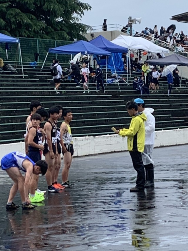雨の競技場は、共通リレーに闘志を燃やしています。