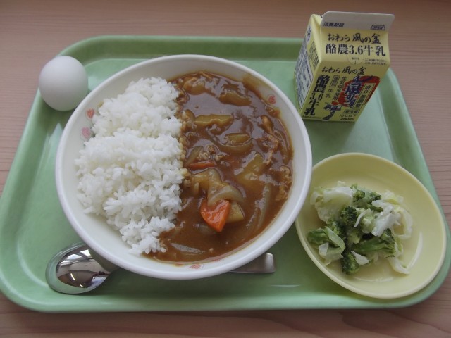 気温の高い日が続き食欲が落ち気味になりますが、カレーライスはグッと食欲を増進させてくれます。特に学校給食のカレーは、薫り高く独特の旨味があり、私は大好きです。さらに今日は花野菜サラダ・ゆで卵の色合いも合わさって、とても華麗な食卓となりました。ごちそうさまでした。