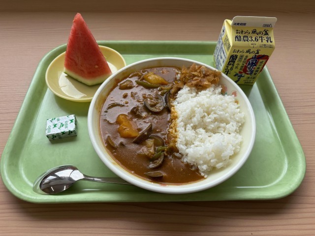 今日は昨日ほど気温は高くありませんが、湿度が高く空気が肌にまとわりつく感じで余計に暑く感じます。そんな中、夏野菜カレーはいつもの給食カレーよりちょっと辛め・スパイシーでしたが、なすやピーマン、かぼちゃがたっぷり入っていて、見た目も味もとっても満足でした。デザートのすいかは、カレーの後に食べたので、より甘く感じました。「今日のすいか、酸いか?」と尋ねられることはありませんでした。