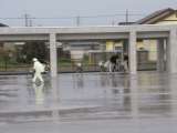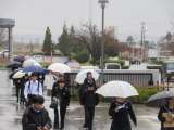 雨の中、自転車通学した生徒は、駐輪場から生徒玄関前まで雨に濡れないように、ヘル...