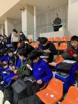 男女に分かれて、試合形式で進めています。 体育館は、10度ちょっとで寒いです。