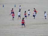 グラウンドでサッカー競技の学習を行っています。曇り空で風も涼しく、気持ちよさそ...