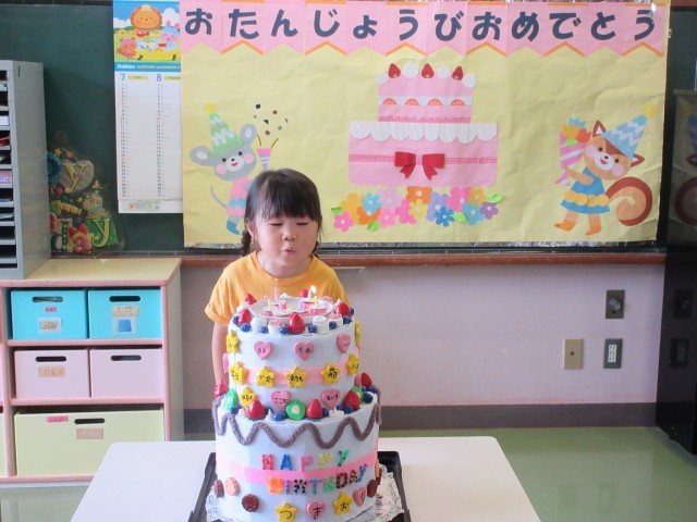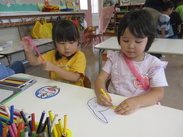 お楽しみコーナーでは、みんなで『夏祭り』をしました。「ヨーヨー釣り、楽しみ!」「くじ引きで何もらえるかな」と始まる前から楽しみな様子でした。『缶つみコーナー』では「たくさん缶を積みたい」と慎重に缶を重ねる姿が見られ、自分の記録をさらに伸ばそうと何度も挑戦していました。『お面コーナー』では、好きなキャラクターのお面を選び、色を塗って丁寧に仕上げていました。友達とくじ引きの景品を見せ合い、笑顔いっぱいの子どもたちでした。