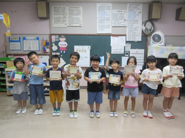 登園日も最終日となりました。ばら組は親子活動で「カレンダーフォトフレーム」をつくりました。事前に用意してきた飾りやシールを貼ったり色を塗ったりして、それぞれに工夫を凝らした素敵なフォトフレームができあがりました!