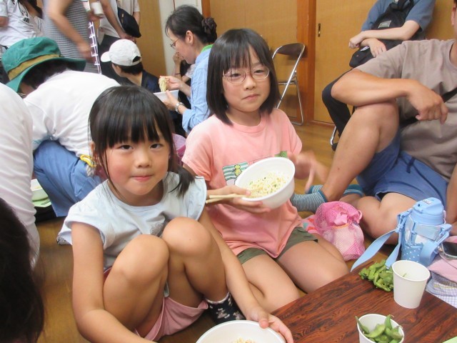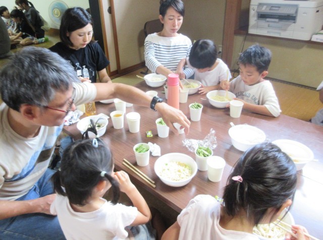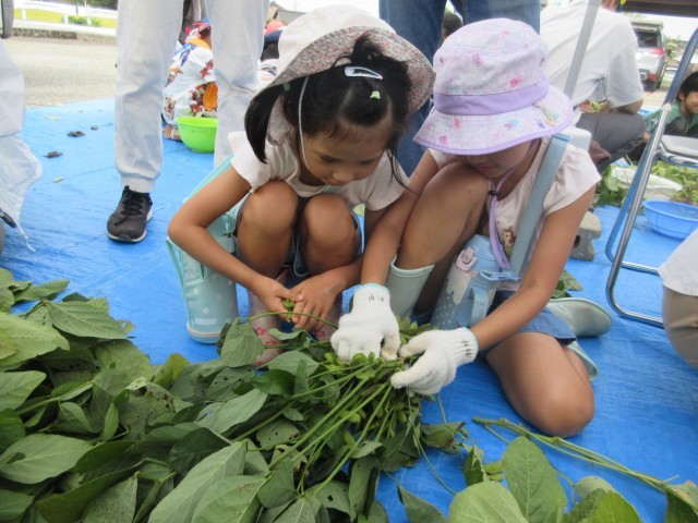 月岡校下ふるさとづくり推進協議会が主催で、5月に種をまいた枝豆が、いよいよ収穫の時期になりました。たくさんの枝豆が実り、参加者全員で枝から実を取り収穫を喜び合いました。初めて体験した子もいて「すごい」「こんなにたくさんついてる」と話していました。枝豆の成長過程も教えていただき、親子で学ぶ機会となりました。その場で茹で上がった枝豆とひやむぎもいただきました。