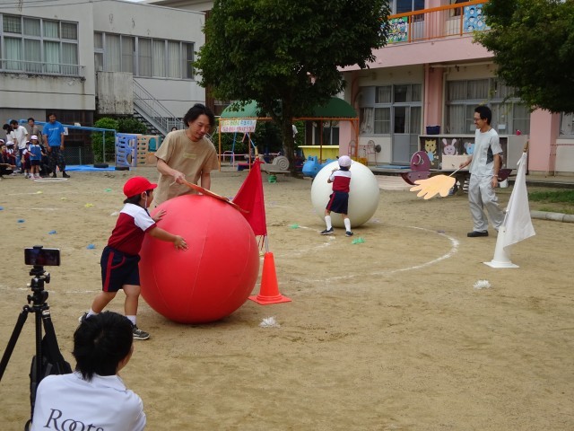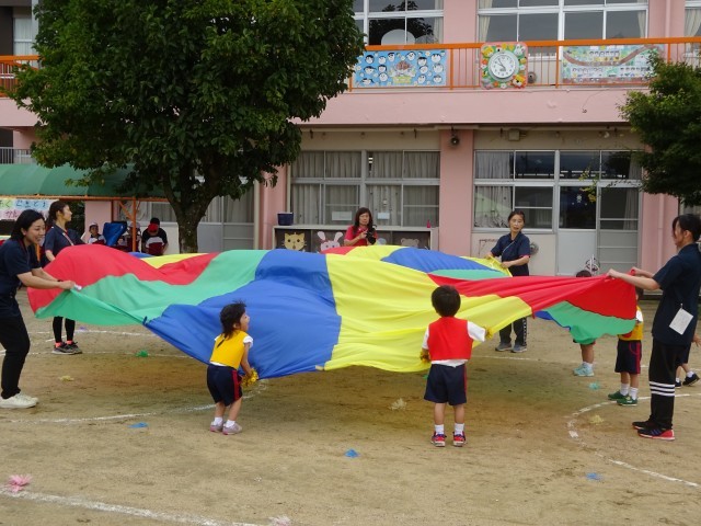 もも・うさぎ組はきらきらポンポンを腕につけて「ハイホー」を踊った後、みんなでバルーンに挑戦しました。強い風にも負けず、腕をぴんと伸ばしたりにこにこで踊ったりと、お家の方に見てもらう嬉しさを感じながら張り切っている姿が見られました。親子サークルの友達も「なかよしレース」へのご参加、ありがとうございました。サークルにも引き続き来てくださいね!