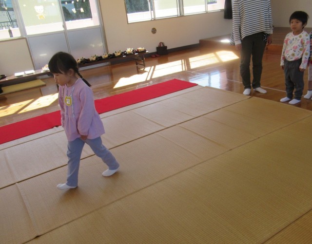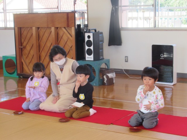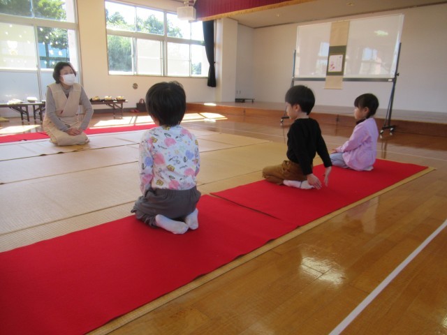 初めてのお茶教室に参加しました。先生に歩き方や挨拶の仕方など作法を教えてもらいました。初めてしてみる作法でしたが、先生に丁寧に教えていただいたので、戸惑わずに真剣に取り組んでいました。楽しみにしていたお菓子も食べ「おいしい!」と味わい、初めて飲む抹茶に「おいしいね」「ちょっと苦い」と言いながら味わっていました。