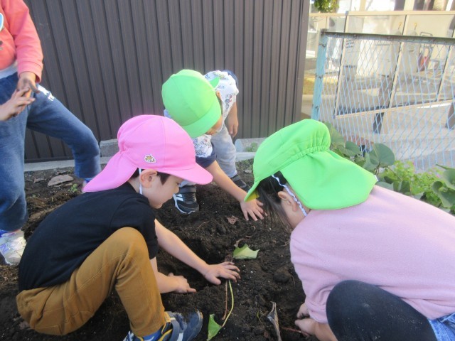 久しぶりの外での活動に喜ぶ子どもたち。熊対策を行いながら、サツマイモ掘りを始めました。みんなで力を合わせて、サツマイモのつるを引っ張ると、つるの先についているサツマイモを見つけ「あった!」「やったー」と大喜び。次々に土の中に眠っているサツマイモを見つけては傷つけないように、そーっと掘っていました。「見えてきた!」「もう少しだ」「一緒に掘るよ」と、友達とも協力してしていました。