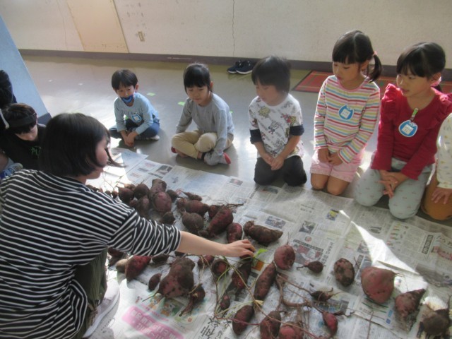 芋掘りの後は、みんなでいくつとれたかを数えました。今年は87個収穫することができました。一番大きくて重たいサツマイモはどれかを決める「イモキングチャンピオン大会」では、ばら組さんが大きいと思うものを6つ選び、重さを競いました。今年、優勝したサツマイモの重さは、1.35キロ。「すごーい!」「おめでとう」と拍手をする子どもたちでした。