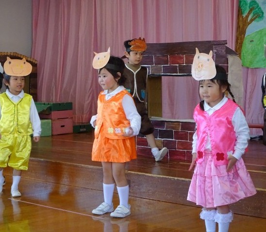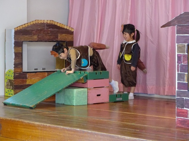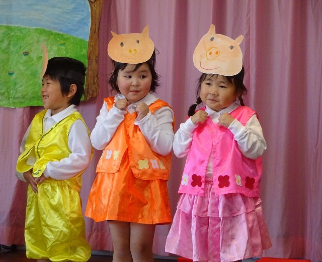 楽器遊びでは、自分たちでリズムを口ずさみながら楽器を演奏していました。劇遊び「3びきのこぶた」では、大きな声で返事をしたりフリフリとお尻を振りながら踊る子供たちに、お家の方からたくさん拍手をもらい、にこにこ笑顔で答えていましたね。「上手にできたよ」「また、やりたいね」「次は何の役をしようかな」ともう次の遊びのことを考えていました。