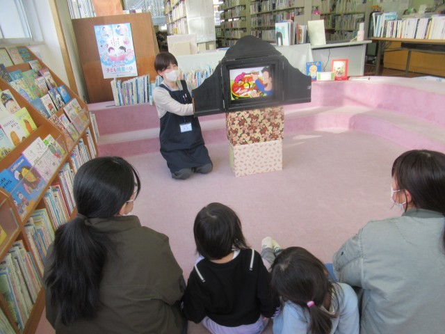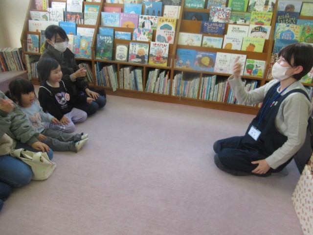 先月から、幼稚園の隣にある富山市立図書館月岡分館へ図書館指導に行っています。その様子を保護者の方にも見てもらうことにしました。子どもたちは「お母さんと一緒に本を選ぶの」と、とても嬉しそうでした。図書館司書の方と手遊びや紙芝居、絵本の読み聞かせをしてもらいました。『おすしのみいちゃんどーこだ』の紙芝居では、お寿司の中に隠れているみいちゃんを探すお話で、一緒に探しながら楽しみました。その後、自分の選んだ絵本を借り満足していた子どもたちでした。
