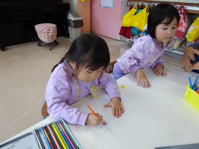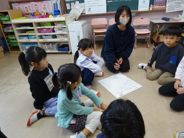 交流会が終わってすぐに「どのような形で、5年生のお兄さんお姉さんにありがとうの気持ちを伝えようか」とクラスごとに話し合っていました。うさぎ組ともも組は、字が書けないから絵で、ばら組はみんなで話し合ってそれぞれが書いた手紙を届けたいということになりました。