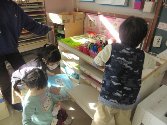 2学期の終業式がありました。2学期を振り返り楽しいことがたくさんあったことや干支の話、正月の過ごし方、年末年始の挨拶の仕方など、いろいろな話を聞きました。長い冬休みになりますが、お正月ならではの遊びをしながら、元気に楽しくお過ごしください。また、各クラスで大掃除をしました。棚や椅子、玩具棚等、自分たちが使った場所をきれいに掃除しました。部屋がピカピカになり、よい年を迎えられそうです。