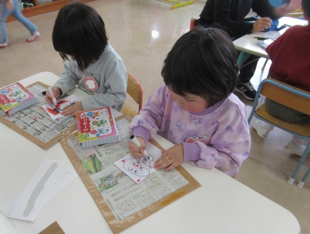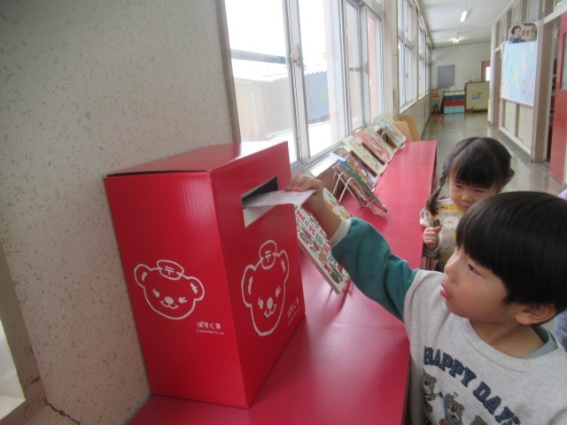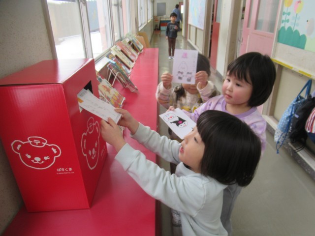 郵便ごっこが始まりました。友達に「お手紙書こう」と子どもたちの顔は真剣です。「友達が喜んでくれるといいな」と思って絵を描いたり、メッセージを書いたりして仕上げています。ポストに入れる時も「届くかな?」とドキドキした様子でした。今月は郵便ごっこを通して、手紙を書く楽しさや友達へ自分の気持ちを伝える喜びを感じていけたらと思います。
