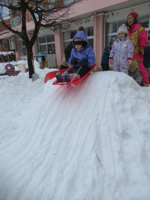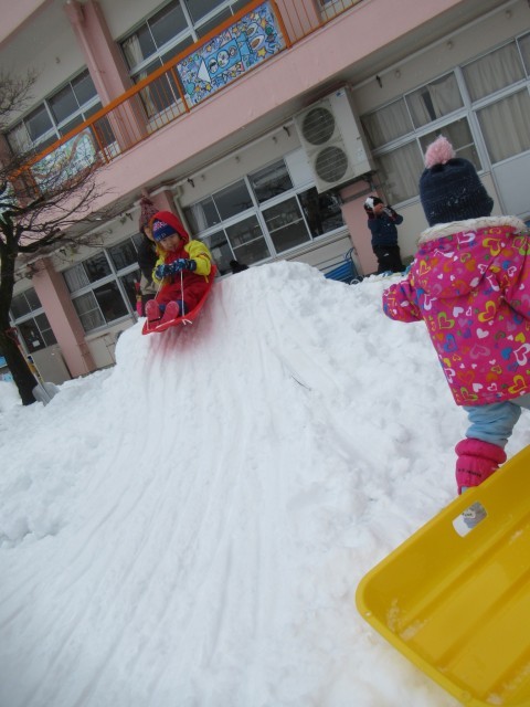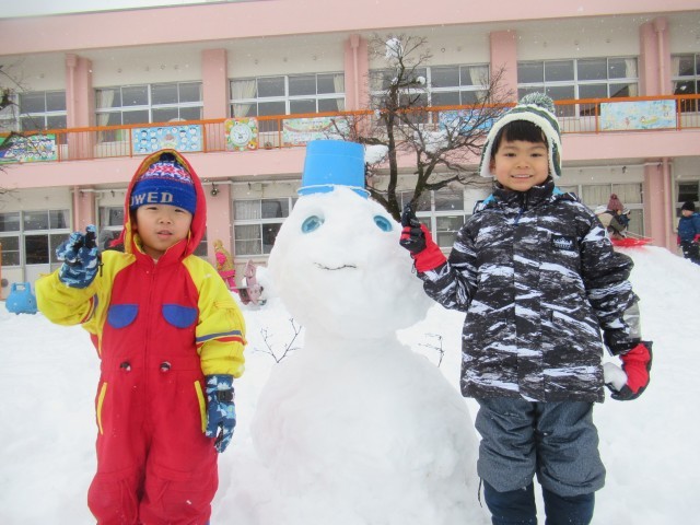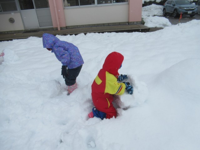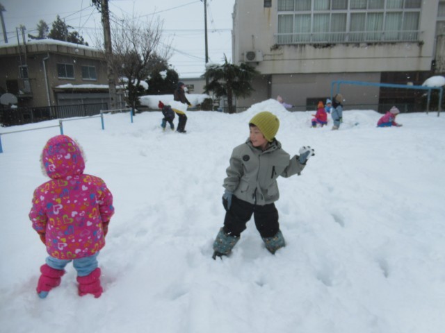 園庭の積もった雪に「今日は雪遊びできる?」と楽しみにしていました。月曜日は小学校の築山にそり遊びに行ってきて、今日は園庭で遊びました。園庭に出ると早速、雪だるまづくりをしたり、友達と雪合戦をしたりして遊ぶ姿が見られました。